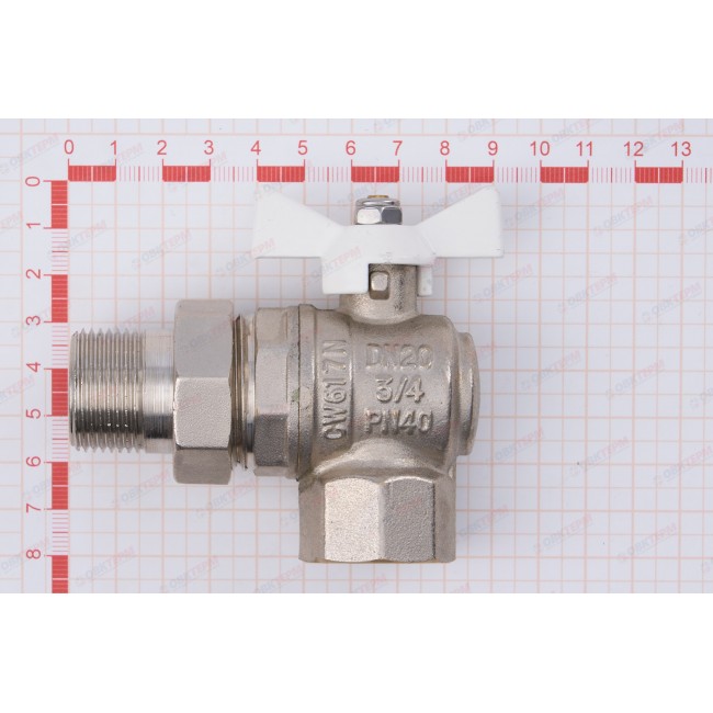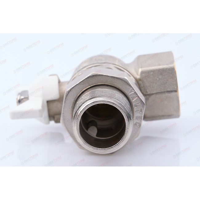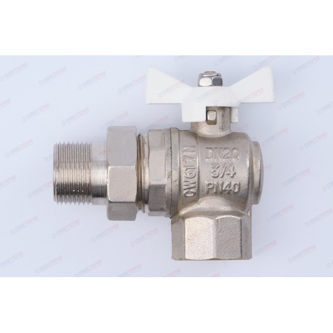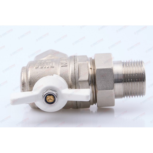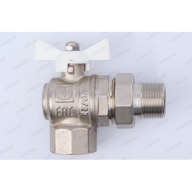 Угловой полнопроходной ремонтопригодный шаровой кран с увеличенным ресурсом. Соединен накидной гайкой с резьбовым полусгоном. Корпуса деталей – латунные, никелированные. Кран оснащен ручкой типа «бабочка» с утолщенной стенкой из алюминиевого сплава и эпоксидным покрытием белого цвета. Резьба присоединений – внутренняя/наружная.