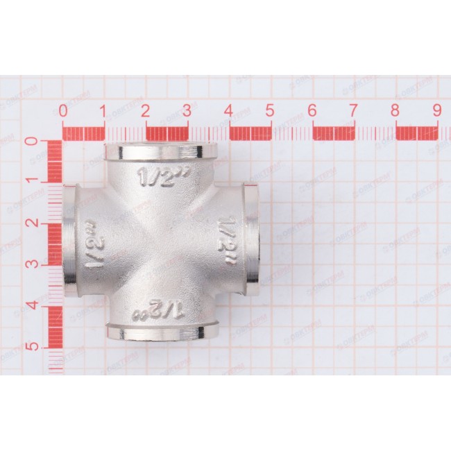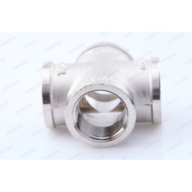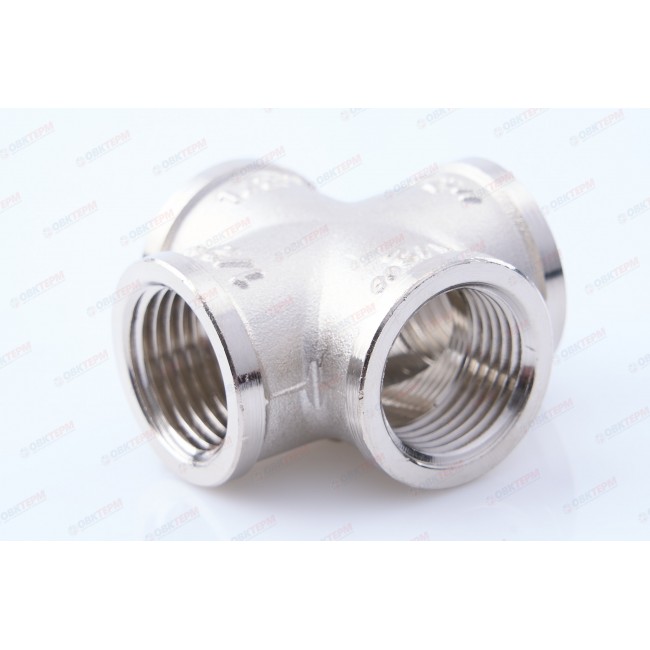 Латунный никелированный четырехсторонний фитинг, равнопроходной. Резьба – внутренняя, цилиндрическая трубная по ГОСТу 6357 (ISO 228, EN 10226), совместимая также с наружной конической трубной резьбой по ГОСТу 6211 (ISO R7).