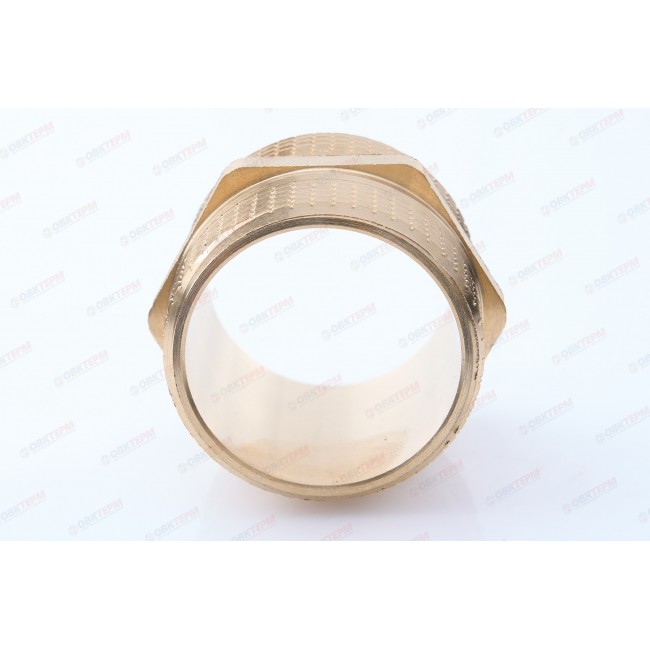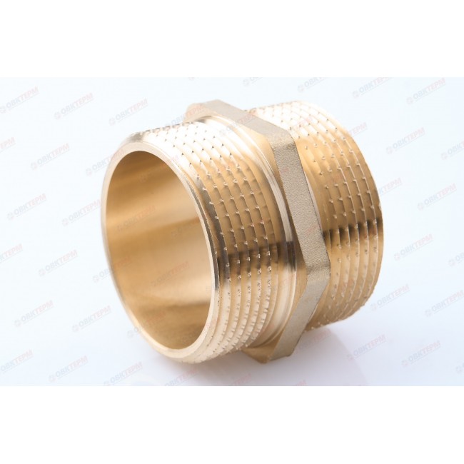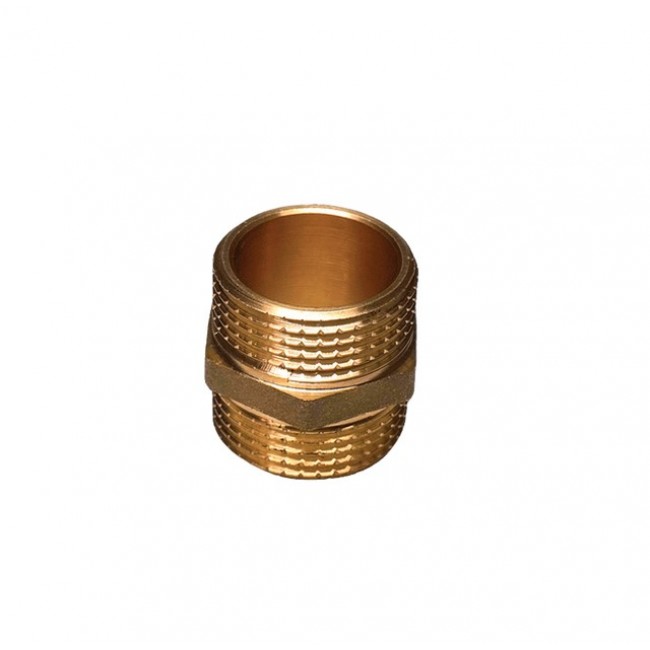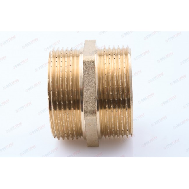 Резьбовой фитинг – ниппель переходной. Обеспечивает соединение элементов трубопровода разного диаметра. Резьба обоих патрубков – наружная.Насечки на резьбе способствуют удержанию герметизирующего материала (например, сантехнического льна). Наличие шестигранного (под гаечный ключ) участка корпуса облегчает монтаж соединения. Максимальная температура использования ниппеля составляет 250 °С (при максимальном рабочем давлении 2,7/1,7 бар – для моделей условным диаметром до/более 1”); Латунные резьбовые соединительные детали используются для создания разъемных резьбовых соединений на трубопроводах холодного питьевого, хозяйственного и горячего водоснабжения, отопления, сжатого воздуха и на технологических трубопроводах, транспортирующих газы и жидкости, неагрессивные к материалу соединителей.