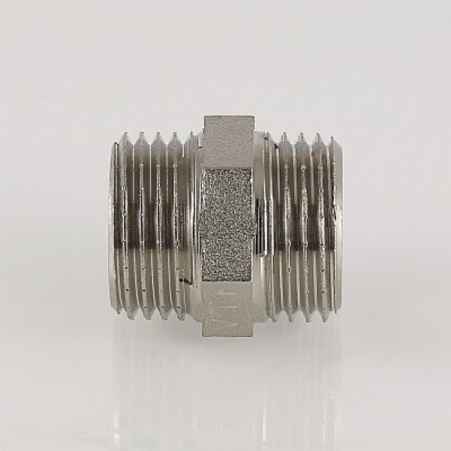 Латунный никелированный фитинг для соединения элементов трубопровода равного диаметра. Резьба – наружная/наружная, цилиндрическая трубная по ГОСТу 6357 (ISO 228, EN 10226). Предусмотрен участок корпуса шестигранной формы, под гаечный ключ.