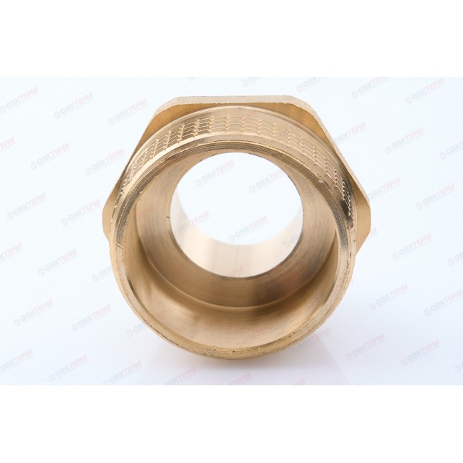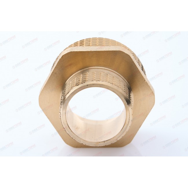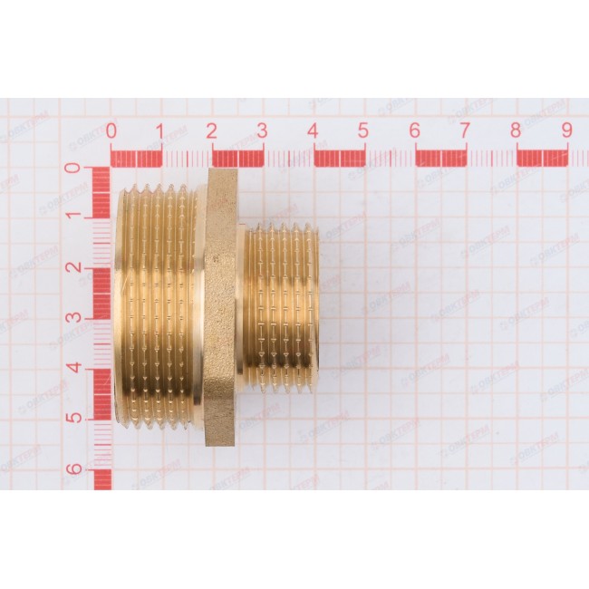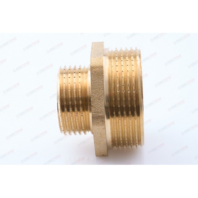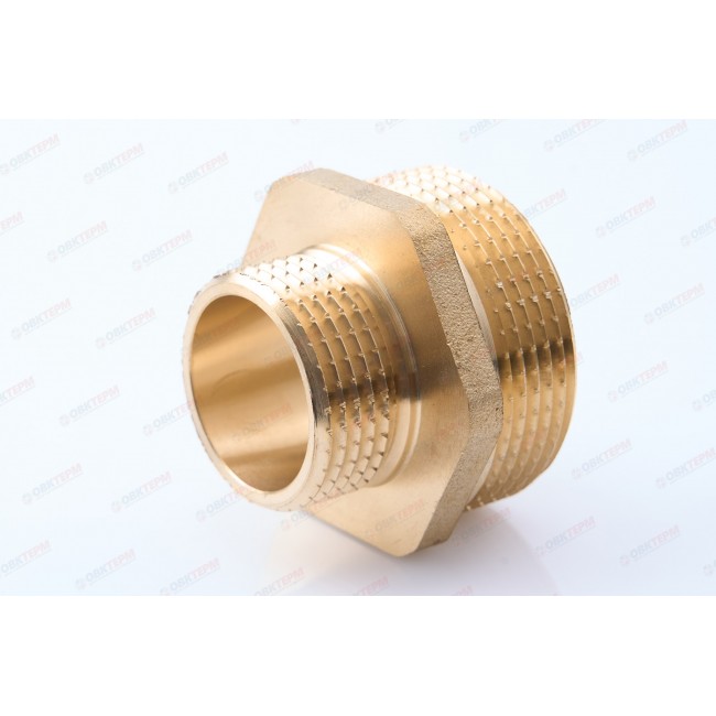 Резьбовой фитинг – ниппель переходной.Обеспечивает соединение элементов трубопровода разного диаметра. Резьба обоих патрубков – наружная.Насечки на резьбе способствуют удержанию герметизирующего материала (например, сантехнического льна). Наличие шестигранного (под гаечный ключ) участка корпуса облегчает монтаж соединения. Максимальная температура использования ниппеля составляет 250 °С (при максимальном рабочем давлении 2,7/1,7 бар – для моделей условным диаметром до/более 1”); Латунные резьбовые соединительные детали используются для создания разъемных резьбовых соединений на трубопроводах холодного питьевого, хозяйственного и горячего водоснабжения, отопления, сжатого воздуха и на технологических трубопроводах, транспортирующих газы и жидкости, неагрессивные к материалу соединителей.