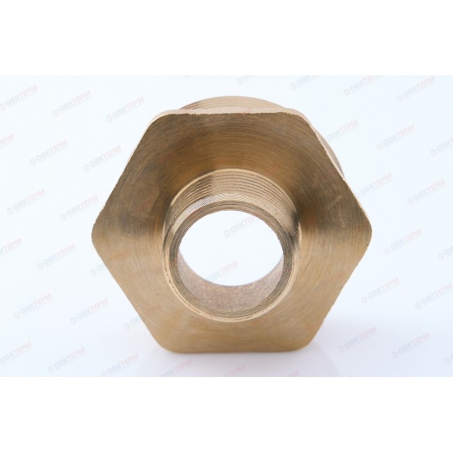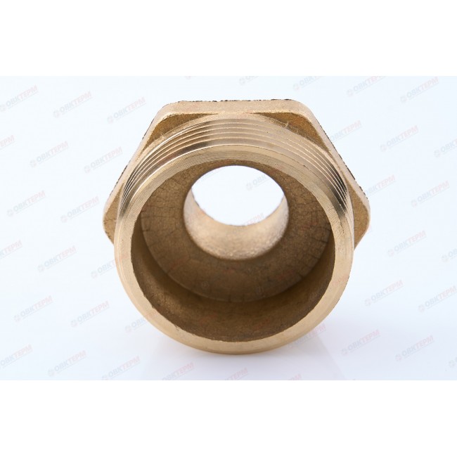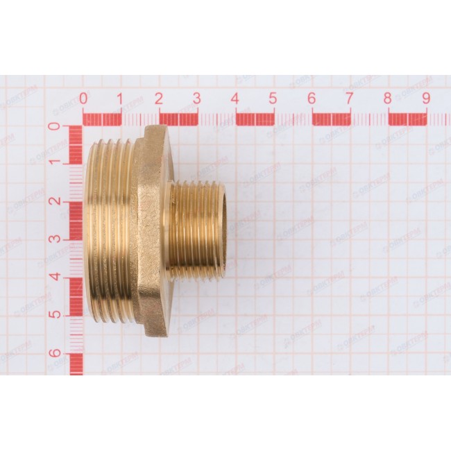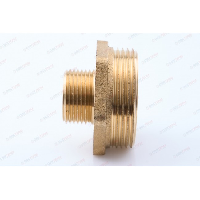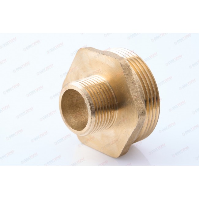 Резьбовой фитинг – ниппель переходной.Обеспечивает соединение элементов трубопровода разного диаметра. Резьба обоих патрубков – наружная.Насечки на резьбе способствуют удержанию герметизирующего материала (например, сантехнического льна). Наличие шестигранного (под гаечный ключ) участка корпуса облегчает монтаж соединения. Максимальная температура использования ниппеля составляет 250 °С (при максимальном рабочем давлении 2,7/1,7 бар – для моделей условным диаметром до/более 1”); Латунные резьбовые соединительные детали используются для создания разъемных резьбовых соединений на трубопроводах холодного питьевого, хозяйственного и горячего водоснабжения, отопления, сжатого воздуха и на технологических трубопроводах, транспортирующих газы и жидкости, неагрессивные к материалу соединителей.