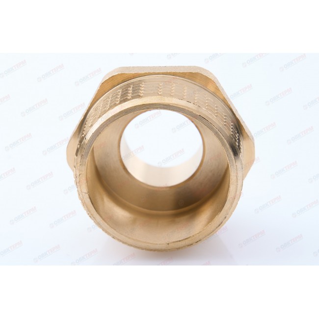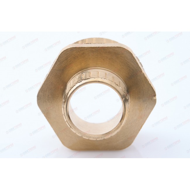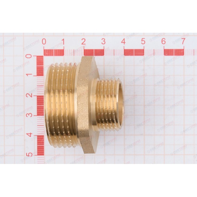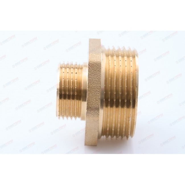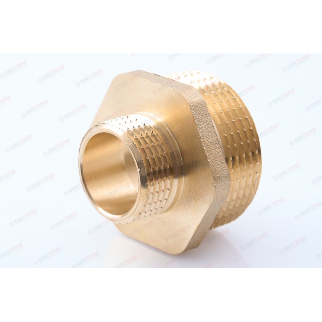 Резьбовой фитинг – ниппель переходной.Обеспечивает соединение элементов трубопровода разного диаметра. Резьба обоих патрубков – наружная.Насечки на резьбе способствуют удержанию герметизирующего материала (например, сантехнического льна). Наличие шестигранного (под гаечный ключ) участка корпуса облегчает монтаж соединения. Максимальная температура использования ниппеля составляет 250 °С (при максимальном рабочем давлении 2,7/1,7 бар – для моделей условным диаметром до/более 1”); Латунные резьбовые соединительные детали используются для создания разъемных резьбовых соединений на трубопроводах холодного питьевого, хозяйственного и горячего водоснабжения, отопления, сжатого воздуха и на технологических трубопроводах, транспортирующих газы и жидкости, неагрессивные к материалу соединителей.