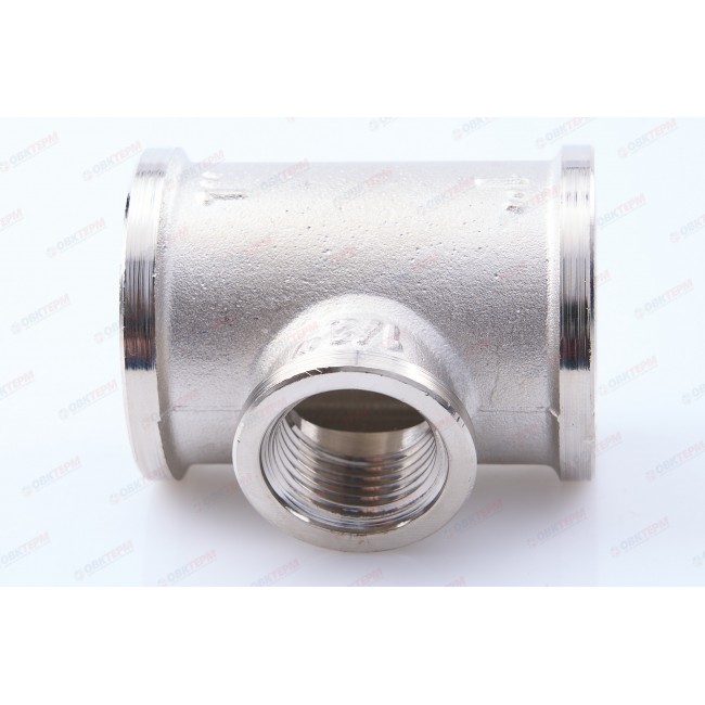 Латунный никелированный трехсторонний фитинг с переходом на меньший диаметр в центральном выходе. Резьба – внутренняя, цилиндрическая трубная по ГОСТу 6357 (ISO 228, EN 10226), совместима также с наружной конической трубной резьбой по ГОСТу 6211 (ISO R7).