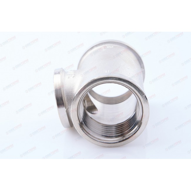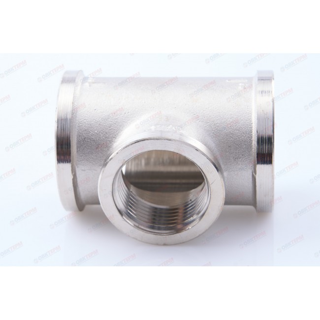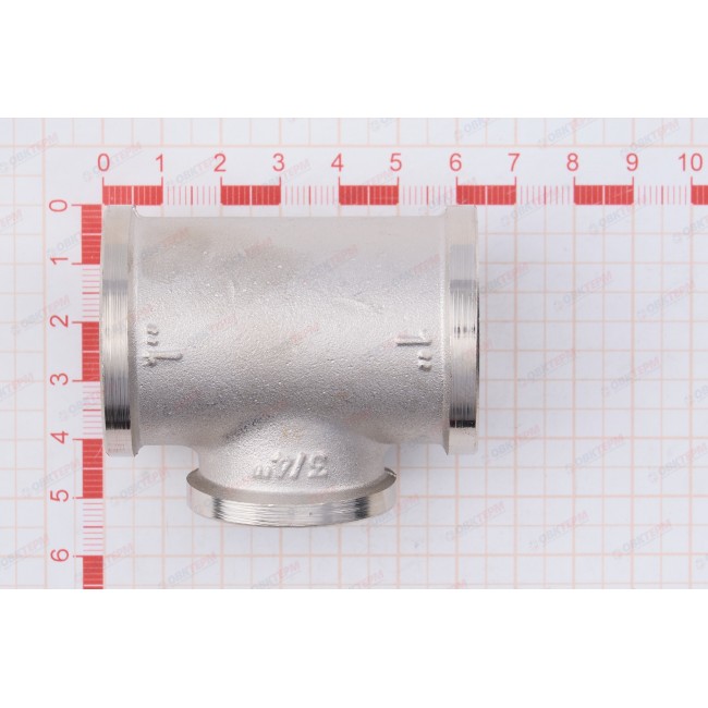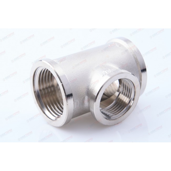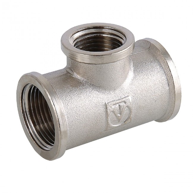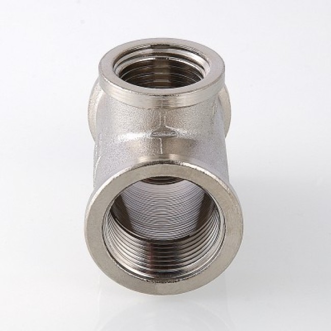 Латунный никелированный трехсторонний фитинг с переходом на меньший диаметр в центральном выходе. Резьба – внутренняя, цилиндрическая трубная по ГОСТу 6357 (ISO 228, EN 10226), совместима также с наружной конической трубной резьбой по ГОСТу 6211 (ISO R7).