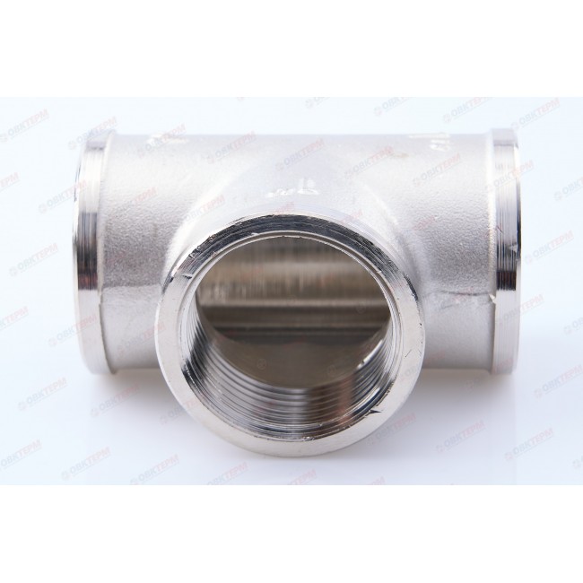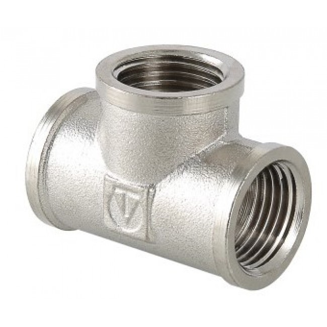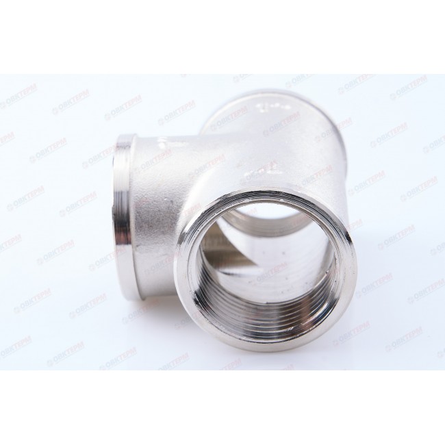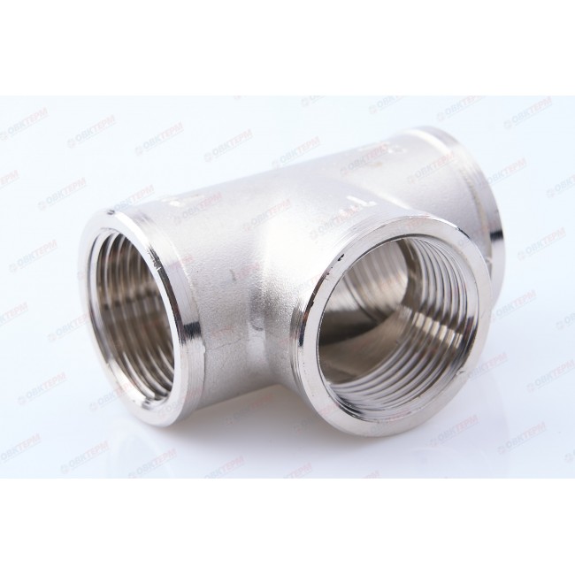 Латунный никелированный трехсторонний фитинг, равнопроходной. Резьба – внутренняя, цилиндрическая трубная по ГОСТу 6357 (ISO 228, EN 10226), совместимая также с наружной конической трубной резьбой по ГОСТу 6211 (ISO R7).