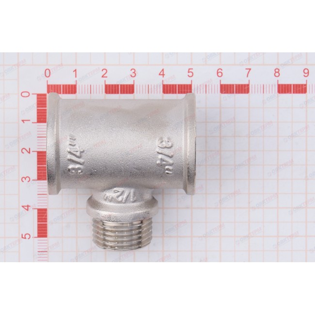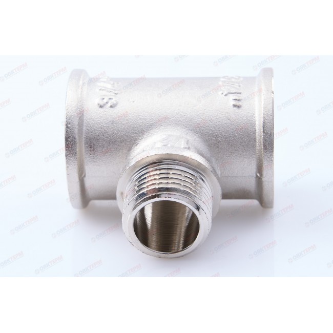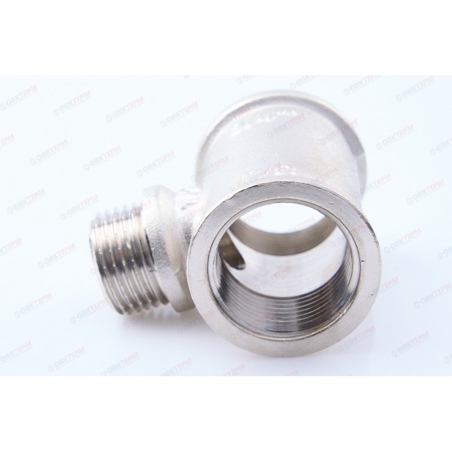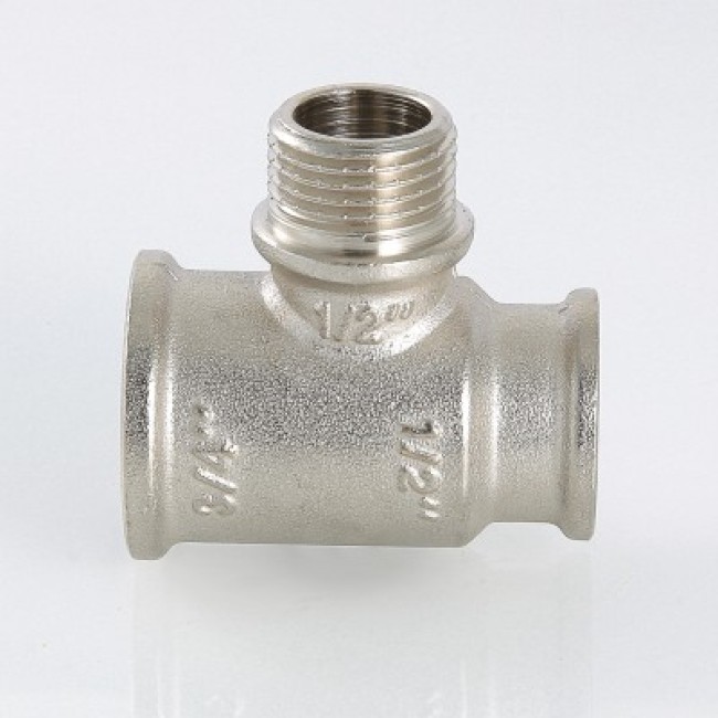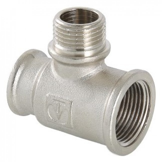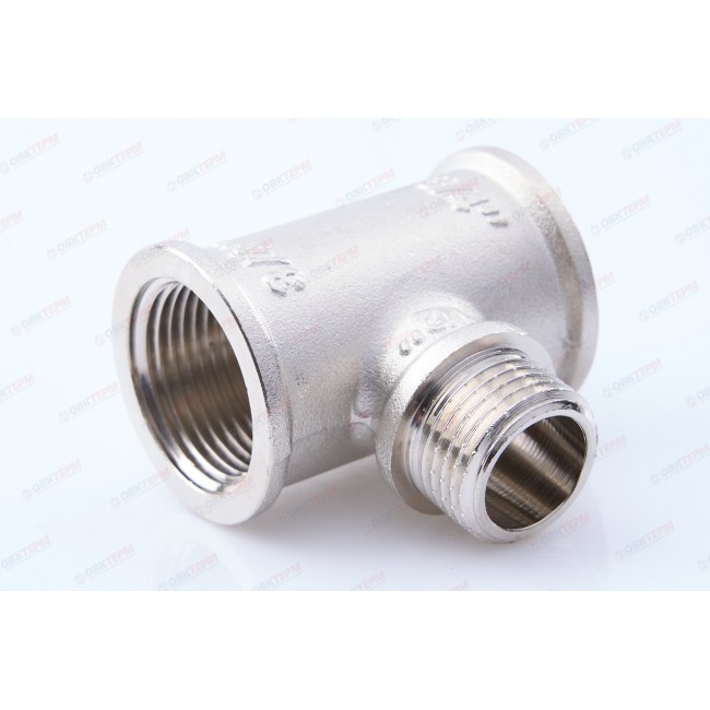 Резьбовой фитинг – тройник переходной с переходом на наружную резьбу изготовлен из латуни марки CW617N методом горячего штампования с последующим нанесением никелевого гальванопокрытия. Применяется для создания разъемных резьбовых соединений на трубопроводах из стальных, медных, латунных, пластиковых и металлопластиковых труб. Комбинация присоединительных патрубков данной модели позволяет смонтировать участок трубопровода соответствующей конфигурации без дополнительных соединителей. Резьба фитинга – трубная цилиндрическая по ГОСТу 6357 (ISO 228, EN 10226), внутренняя/наружная/внутренняя.
