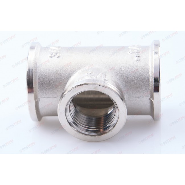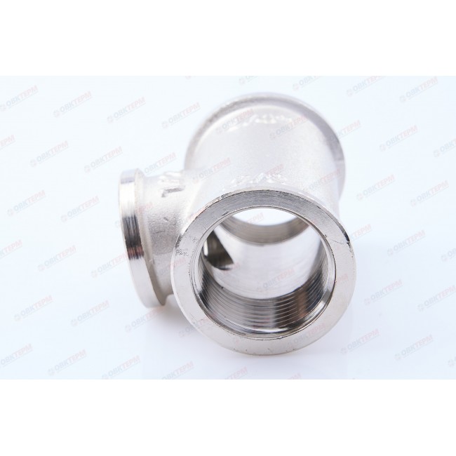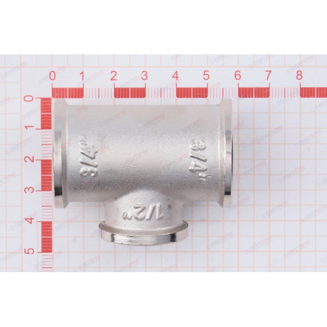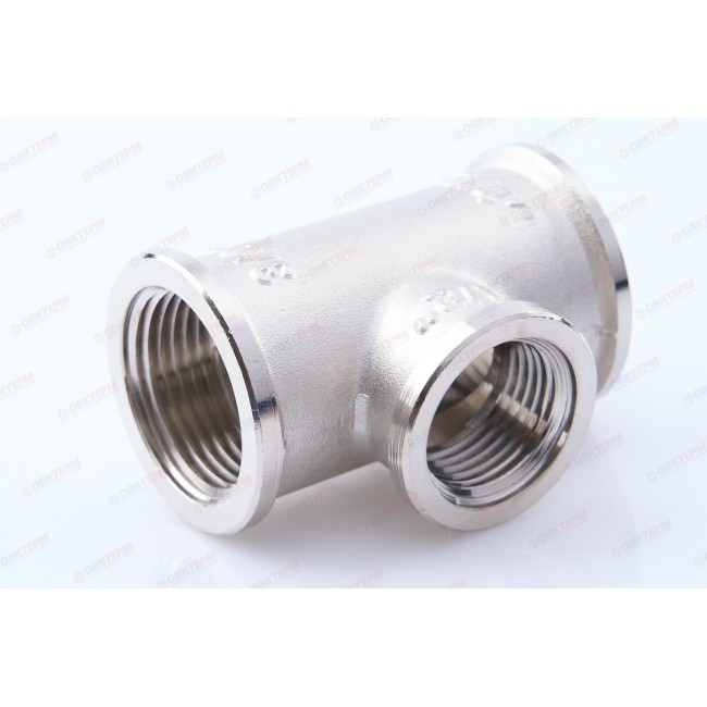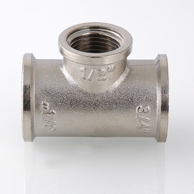 Латунный никелированный трехсторонний фитинг с переходом на меньший диаметр в центральном выходе. Резьба – внутренняя, цилиндрическая трубная по ГОСТу 6357 (ISO 228, EN 10226), совместима также с наружной конической трубной резьбой по ГОСТу 6211 (ISO R7).