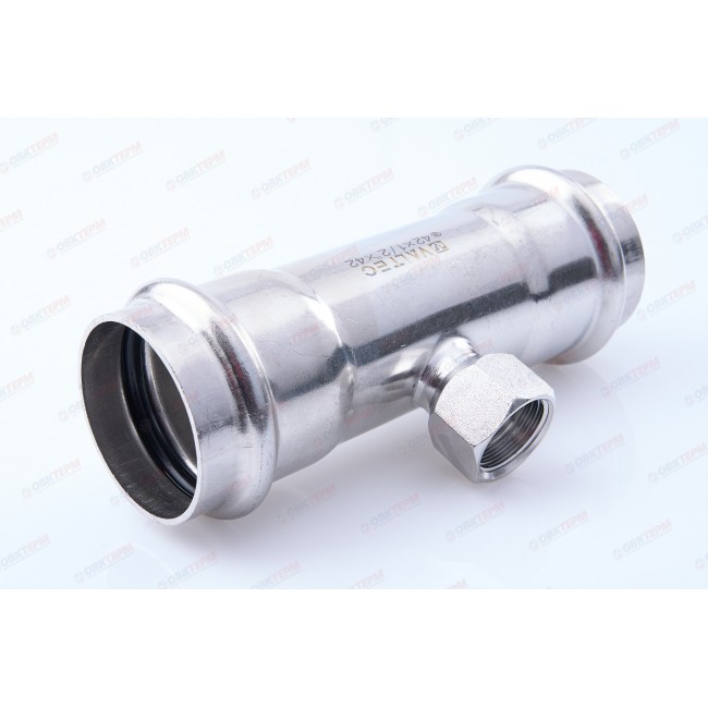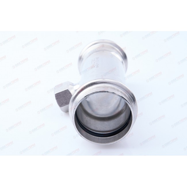 Пресс-тройник из нержавеющей стали с внутренней резьбой предназначен для соединения тонкостенных стальных труб с резьбовым элементом системы водоснабжения, отопления, других инженерных и технологических установок. Фитинг рассчитан на эксплуатацию при максимальной рабочей температуре 120 °С. Номинальное давление – 16 бар. Двухраструбный тройник с внутренней резьбой VTi.932.l изготовлен из стали AISI 304. Материал уплотнительных колец – эластомер EPDM. Отдельно можно приобрести уплотнительные кольца из FPM (витон); в этом случае максимальная рабочая температура увеличивается до 140 °С. Достоинством бесштуцерных соединителей является малый коэффициент местного сопротивления (сужение канала практически отсутствует). Фитинг рассчитан на обжатие с помощью пресс-инструмента V-профиля.