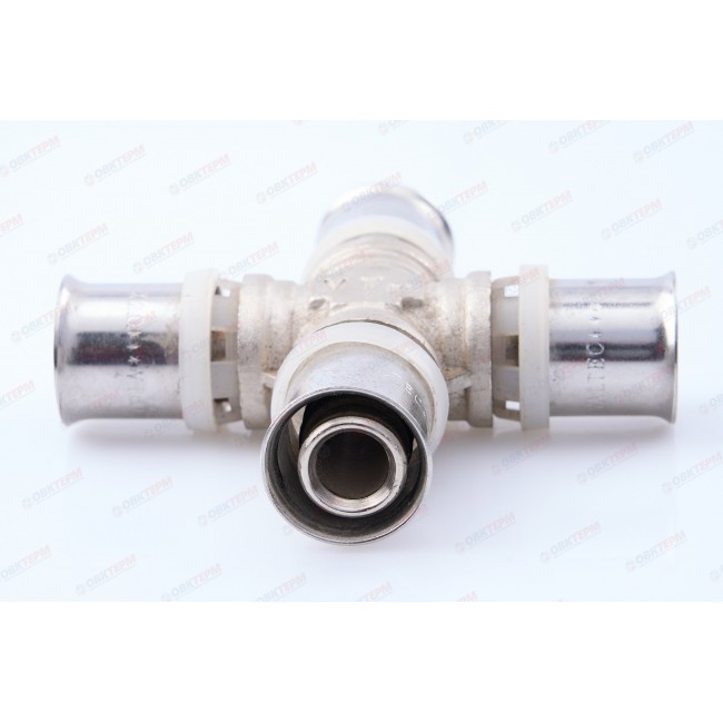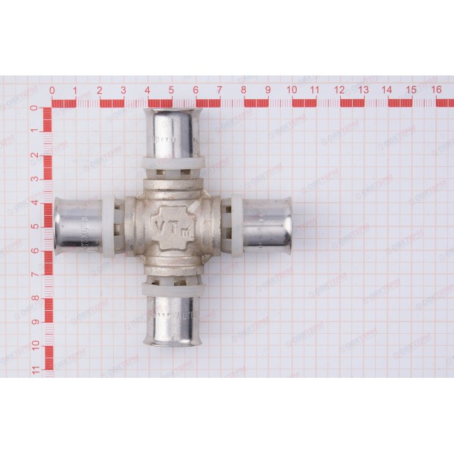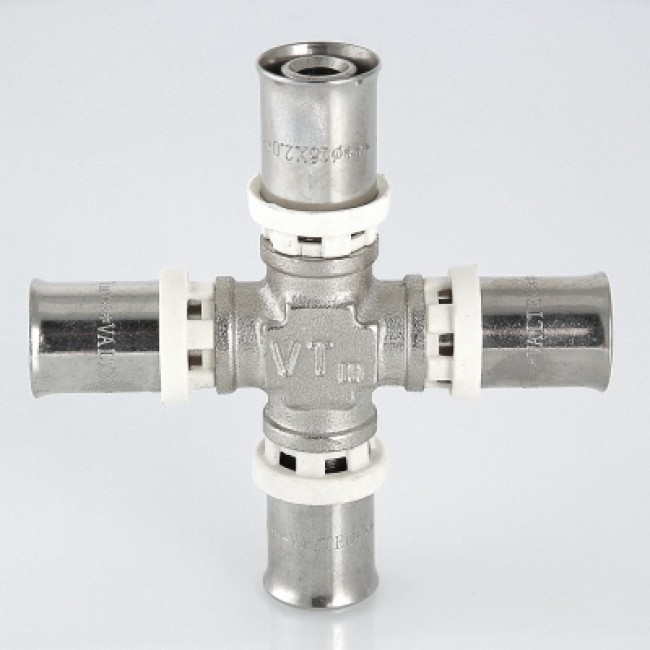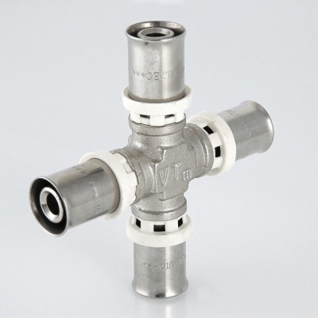 Пресс-фитинг – крестовина предназначен для соединения четырех металлополимерных труб (металлопластиковых труб) или труб из сшитого полиэтилена. Типоряд пресс-крестовин VALTEC включает в себя равнопроходные модели и модели с выходами разного диаметра.
