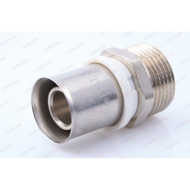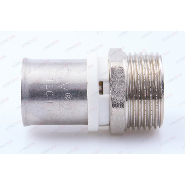 Пресс фитинг для металлопластиковых труб TIM — переходник с трубы 26 (2.6 мм) на металл 1" НР, монтируемый с использованием специального инструмента. Кроме соединения из металлопласта этим способом можно соединять PEX и PE-RT трубы такого же диаметра и толщины стенки. Конструкция после выполнения работ получается неразъемной