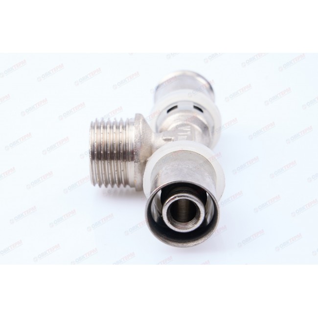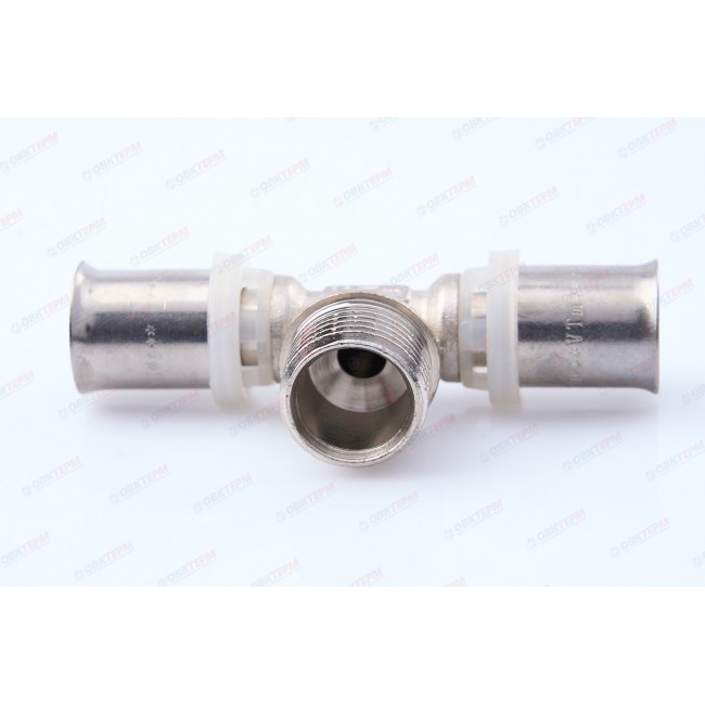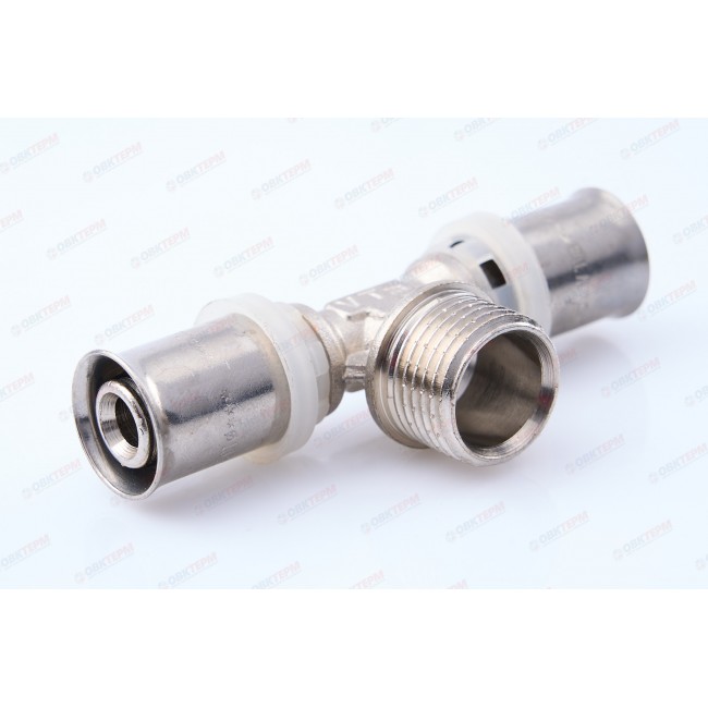 Количество в упаковке : 10шт. Пресс-фитинг – тройник с переходом на наружную резьбу предназначен для подсоединения к металлопластиковым (металлополимерным) трубам или трубам из сшитого полиэтилена элемента системы с внутренней резьбой. Резьба фитинга – трубная по ГОСТу 6357.