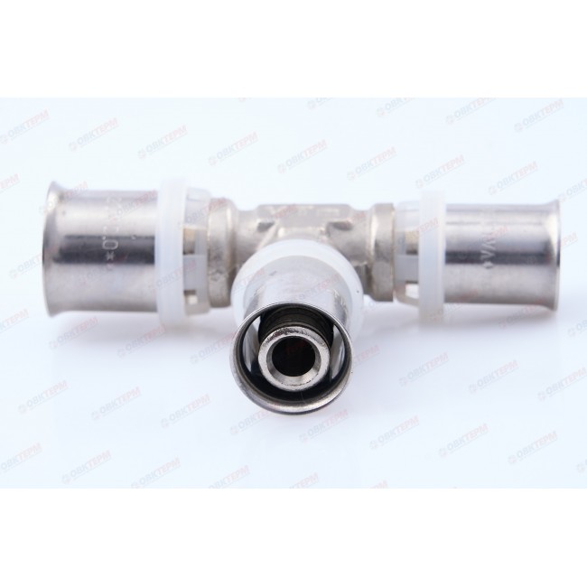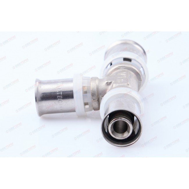 Пресс-фитинг – тройник предназначен для соединения трех труб – металлопластиковых либо из сшитого полиэтилена. Корпус выполнен из сантехнической латуни марки CW617N, уплотнительные кольца штуцеров – из EPDM плотностью 1,22 г/см3, пресс-гильзы – из нержавеющей стали. Нейлоновая обойма выполняет функции фиксатора гильзы, направляющей для пресс-насадок и диэлектрической прокладки, прерывающей контакт между алюминием трубы и латунью корпуса. Конструкция пресс-фитингов VALTEC обеспечивает повышенную пропускную способность, надежность соединений, прочность и термостойкость. Монтаж фитинга производится пресс-инструментом с насадкой «ТН». Типоряд содержит равнопроходные и переходные пресс-тройники.