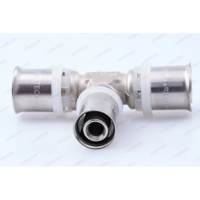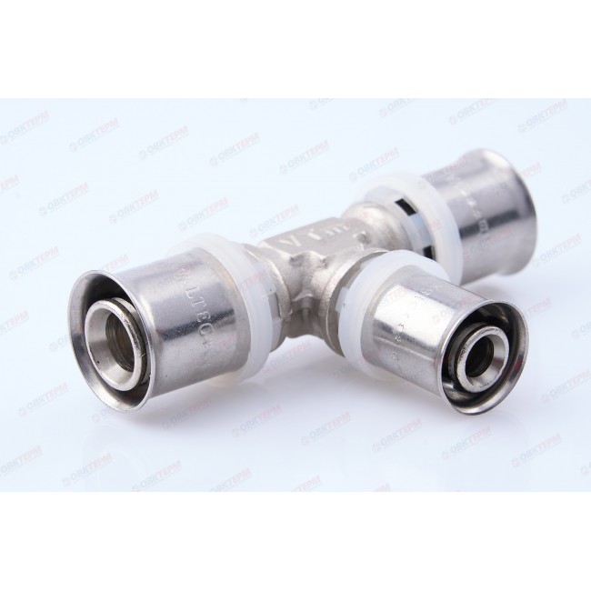 Количество в упаковке: 5шт. Пресс-фитинг – тройник предназначен для соединения трех труб – металлопластиковых либо из сшитого полиэтилена. Корпус выполнен из сантехнической латуни марки CW617N, уплотнительные кольца штуцеров – из EPDM плотностью 1,22 г/см3, пресс-гильзы – из нержавеющей стали. Нейлоновая обойма выполняет функции фиксатора гильзы, направляющей для пресс-насадок и диэлектрической прокладки, прерывающей контакт между алюминием трубы и латунью корпуса. Конструкция пресс-фитингов VALTEC обеспечивает повышенную пропускную способность, надежность соединений, прочность и термостойкость. Монтаж фитинга производится пресс-инструментом с насадкой «ТН». Типоряд содержит равнопроходные и переходные пресс-тройники.