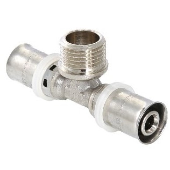 Количество в упаковке: 10шт. Пресс-фитинг – тройник с переходом на наружную резьбу предназначен для подсоединения к металлопластиковым (металлополимерным) трубам или трубам из сшитого полиэтилена элемента системы с внутренней резьбой. Резьба фитинга – трубная по ГОСТу 6357.