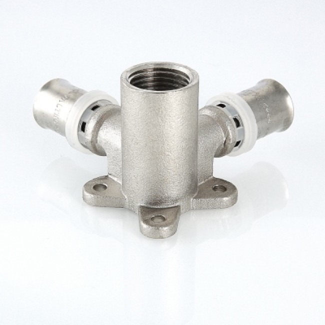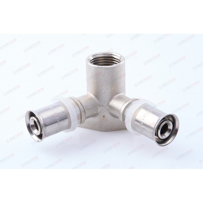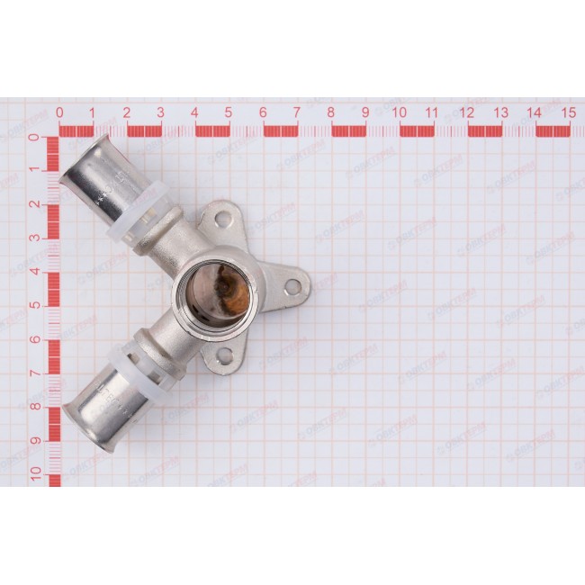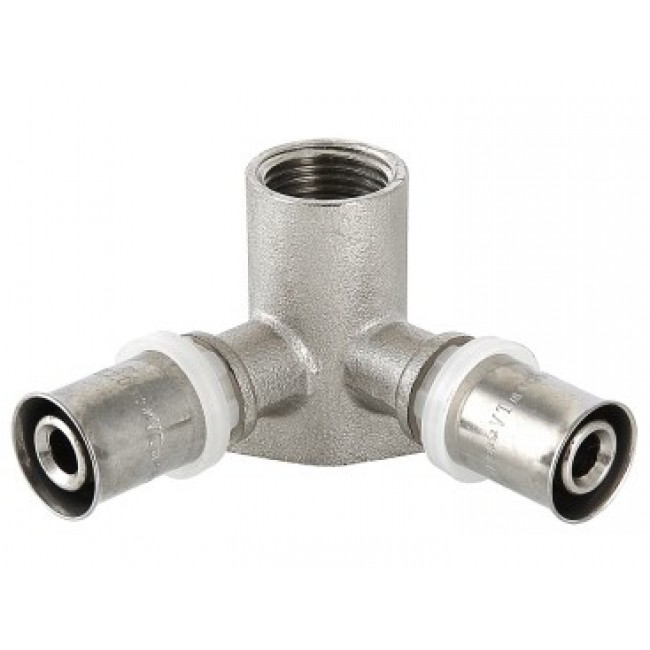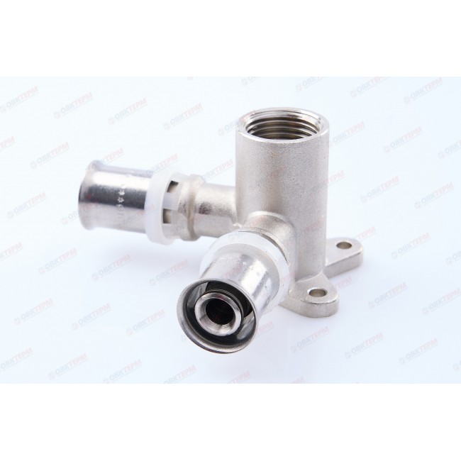 Количество в упаковке: 10шт. Угловой пресс-фитинг-тройник с креплением (проходная водорозетка) предназначен для присоединения к металлопластиковым (металлополимерным) трубам и трубам из сшитого полиэтилена элемента системы, имеющего наружную резьбу. Резьба фитинга – внутренняя трубная по ГОСТу 6357.