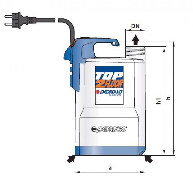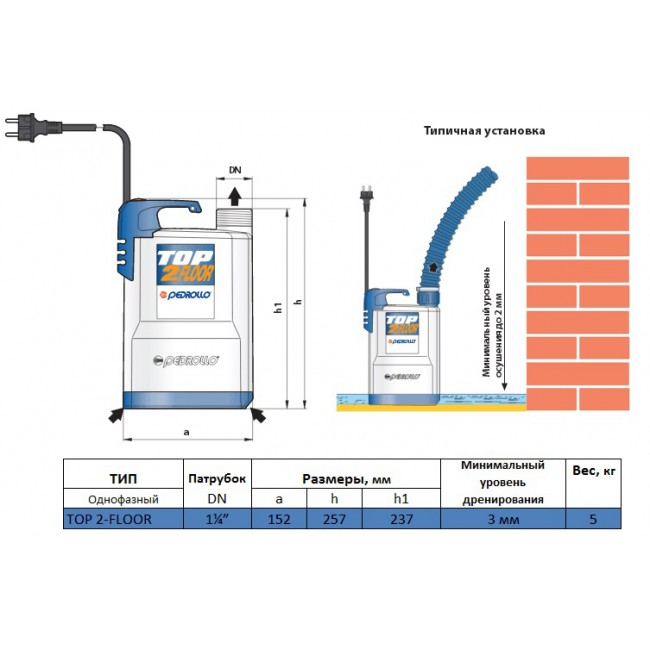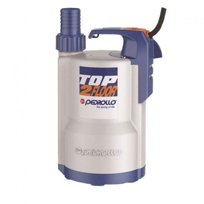 Дренажный погружной насос ТOP 2 FLOOR Pedrollo с двойным механическим уплотнением и полным охлаждением двигателя. Подходят для перекачивания чистой, без абразивных частиц, воды с твердыми частицами во взвешенном состоянии не более 2мм. Наиболее эффективны в быту, когда необходимо экстренно осушить небольшие затопленные помещения, а также во всех случаях, когда необходима максимальная степень осушения. Минимальный уровень осушения составляет 2мм от дна. Прохождение твердых частиц до Ø 2мм. Глубина погружения до 3 метров.Электрическое напряжение двигателя - 220В, 50Гц; Охлаждение – водяное, встроенная в обмотку тепловая защита; Мощность двигателя – 370Вт (0,37кВт); Сила тока – 2 А; Класс изоляции –F; Класс защиты – IP X8;Прохождение твердых взвешенных частиц – до Ø 2мм;