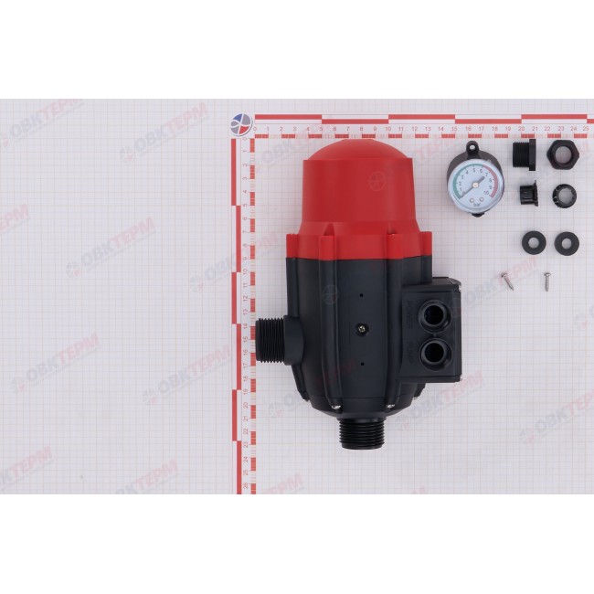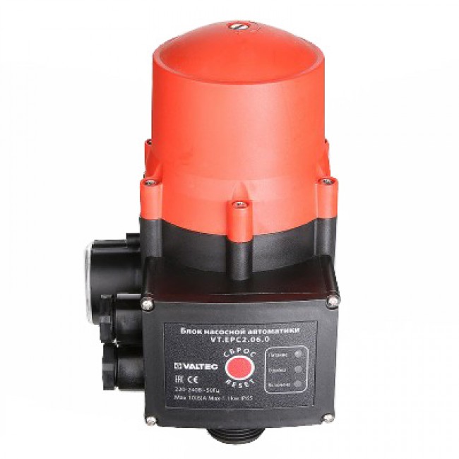Блок насосной автоматики (пресс-контроль) VT.EPC2.06.0 является комбинацией реле минимального давления с реле протока и служит для управления насосами водоснабжения, их защиты от работы «на закрытую задвижку» и в режиме «сухого хода». Когда при водопотреблении давление в сети опускается ниже настроечного, блок пускает насос, обеспечивая подачу воды пользователям. Значение давления включения можно задать самостоятельно, в диапазоне от 1,5 до 3,0 бара (заводская настройка – 1,5 бара). После прекращения разбора воды выключение насоса происходит с задержкой в 8 с, что исключает возникновение гидроудара. При отсутствии воды во всасывающей линии блок отключает насос с задержкой 10–15 с, защищая его от «сухого» хода.