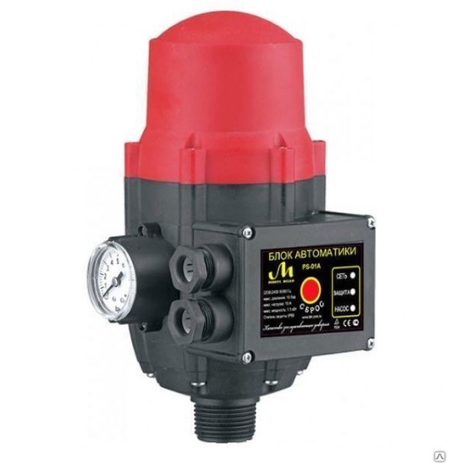 Блок насосной автоматики (пресс-контроль) PS-01A является комбинацией реле минимального давления с реле протока и служит для управления насосами водоснобжения,их защиты от работы " на закрытую задвижку" и в режиме "сухого хода".Может использоваться в водопроводной системе как с гидроаккумулятором,так и без него.Блок контроля насоса в процессе работы отслеживает поток воды через собственную гидравлическую часть и давление воды в месте его подключения к водопроводной системе. Максимальная температура воды : 1- 60 *С. Максимальный ток : 10 А. Максимальное давление : 10 бар. Напряжение питания : 220 - 250 В. Регулируемый диапазон давления : 1.5 - 3 бар. Класс электрической защиты : IP 65