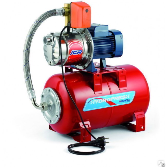 Комплектация: Однофазный электронасос; Реле давления; Гибкий шланг; Гидроаккумулятор емкостью 24 литра; Манометр; Муфта из латуни; Кабель 1,5 м с вилкой Шуко.