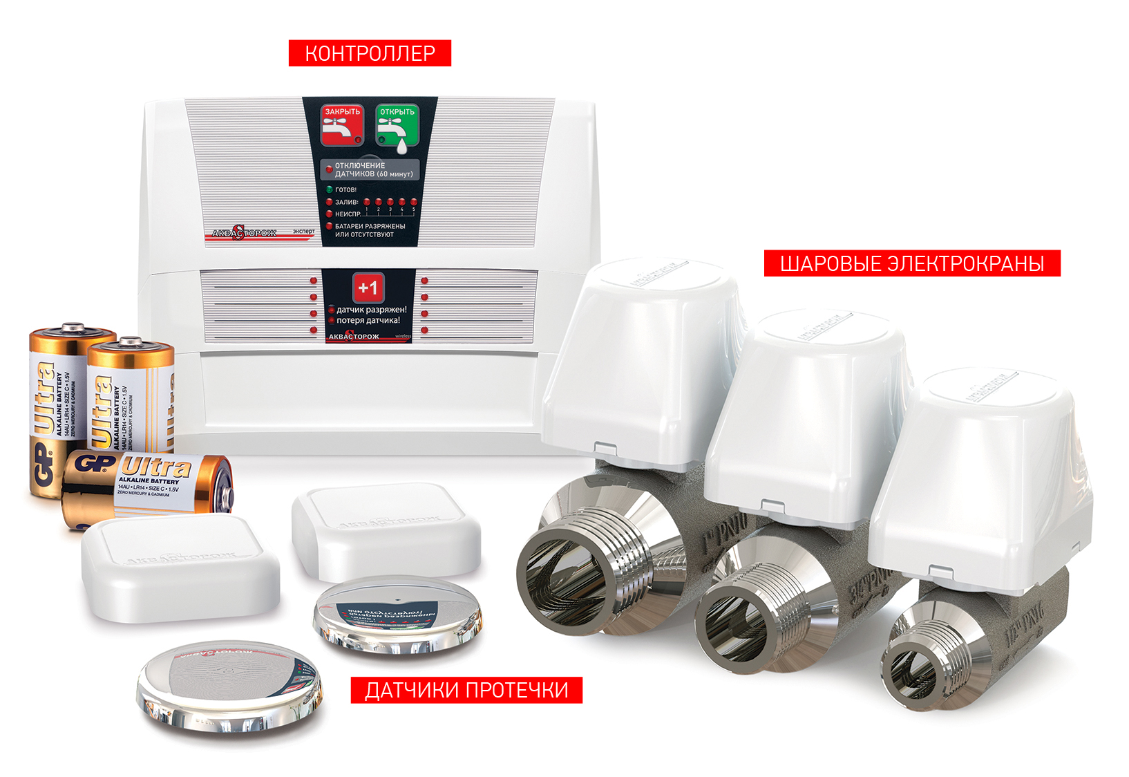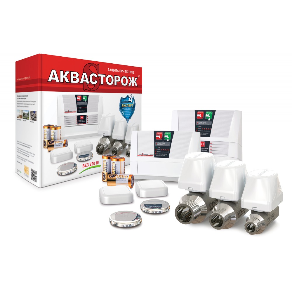 В продаже появилась электронно-механическая система «Аквасторож», которая cостоит из трех обязательных компонентов: контроллера, шарового электрокрана и датчика протечки «Аквасторож». Предназначена для информирования пользователя о протечке воды и минимизации последствий аварии в системе водоснабжения.
