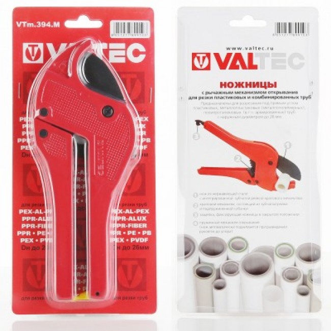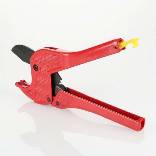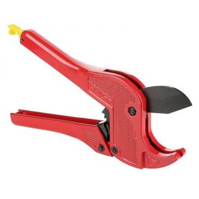 Разрезание пластиковых, металлопластиковых труб – ответственная операция, которую следует производить с применением специального инструмента. Ножницы для труб VALTEC оснащены лезвием из нержавеющей стали, зубчатым храповым и рычажным открывающим механизмами, фиксирующей защелкой. Перпендикулярный разрез трубы без деформации стенок обеспечивает конфигурация опорной скобы, поступательное движение ножа, поднятие которого происходит при разведении рукояток. Изделие рекомендуются для диаметров до 26 мм.