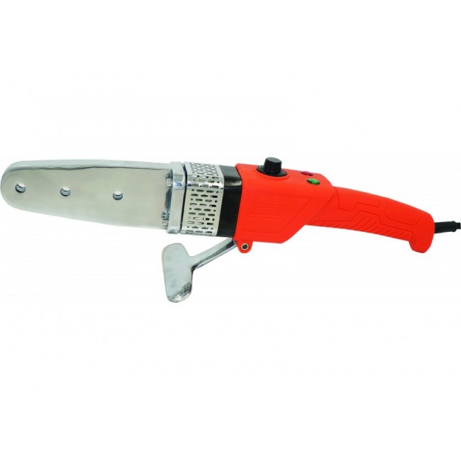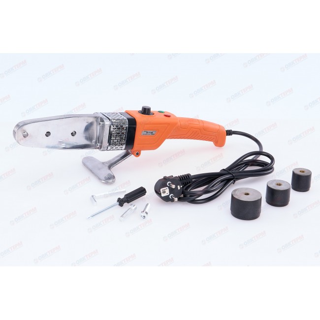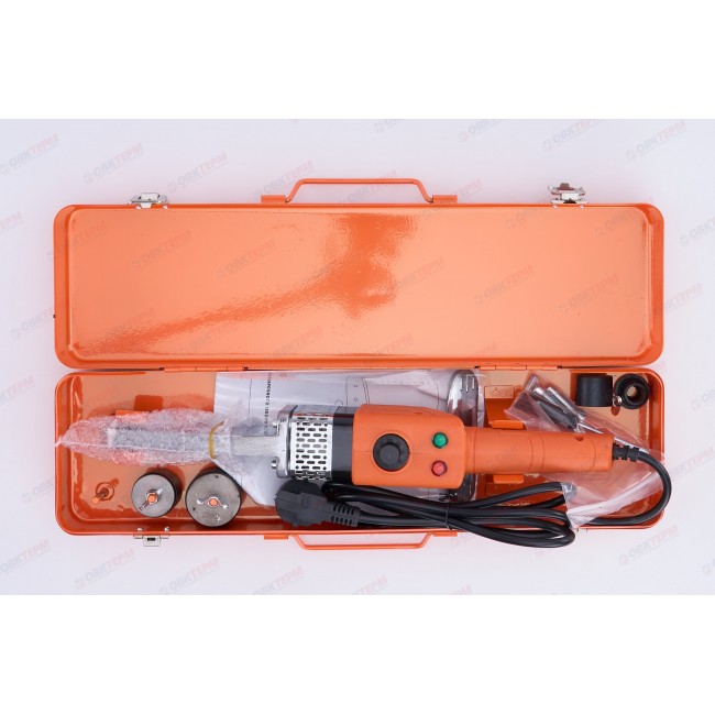 Двойной нагревательный элемент. Нагреватель из алюминия. Для облегчения работы кнопки включателя оснащены подсветкой. Снабжен термостатом. Комплект оснащен шестью парами насадок для пайки PP-R труб и фитингов. Размер насадок 20мм/25мм/32мм/40мм/50мм/63мм.