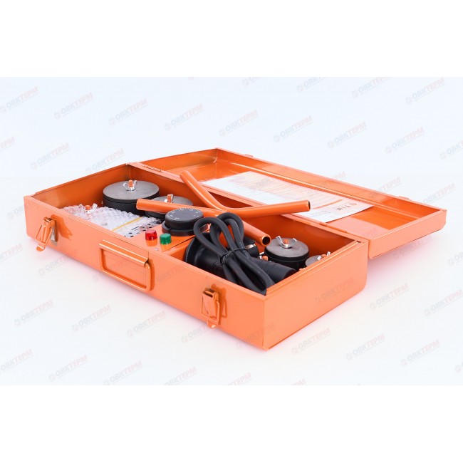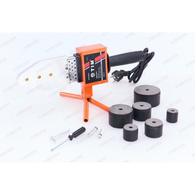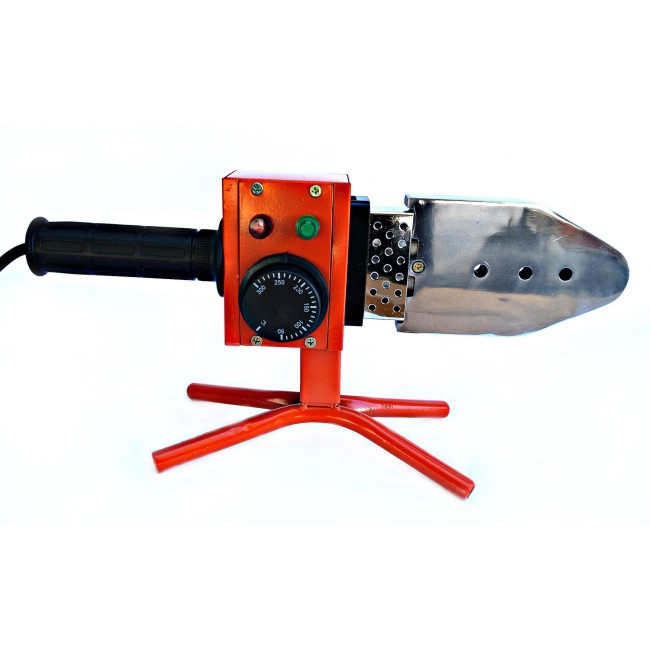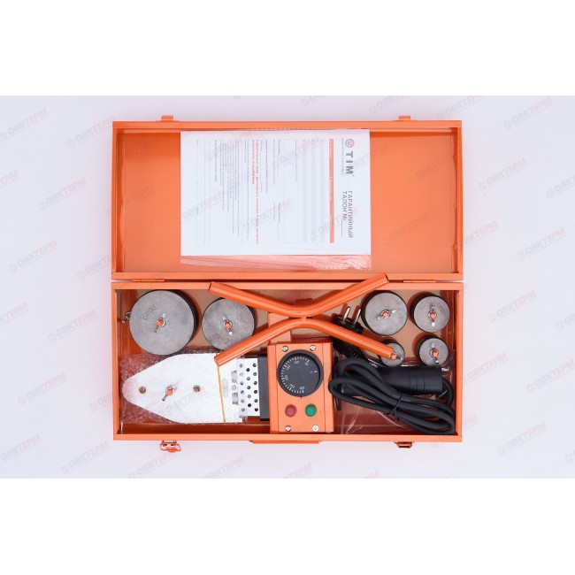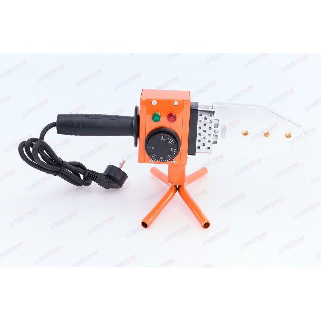 Двойной нагревательный элемент. Нагреватель из алюминия. Для облегчения работы кнопки включателя оснащены подсветкой. Снабжен термостатом. Комплект оснащен шестью парами насадок для пайки PP-R труб и фитингов. Размер насадок 20мм/25мм/32мм/40мм/50мм/63мм.