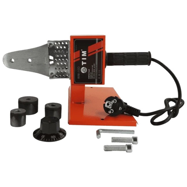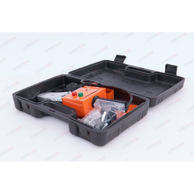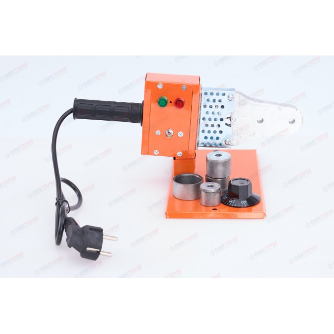 Двойной нагревательный элемент. Нагреватель из алюминия. Для облегчения работы кнопки включателя оснащены подсветкой. Снабжен термостатом. Комплект оснащен шестью парами насадок для пайки PP-R труб и фитингов. Размер насадок 20мм/25мм/32мм/40мм/50мм/63мм.