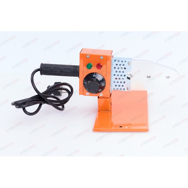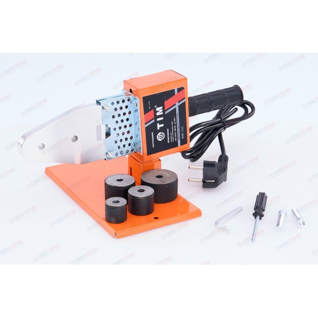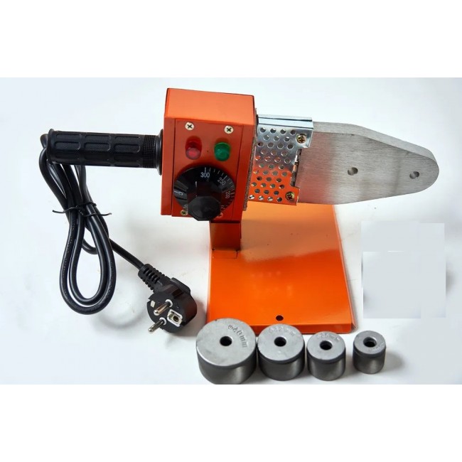 Двойной нагревательный элемент. Нагреватель из алюминия. Для облегчения работы кнопки включателя оснащены подсветкой. Снабжен термостатом. Комплект оснащен шестью парами насадок для пайки PP-R труб и фитингов. Размер насадок 20мм/25мм/32мм/40мм/50мм/63мм.
