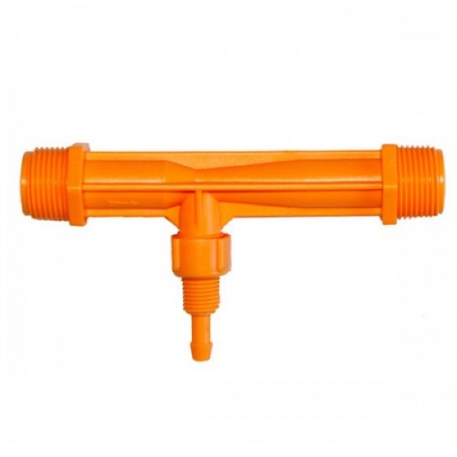 Количество в упаковке: 10шт. Инжектор «Вентури» предназначен для внесения удобрений при капельном поливе. Используется для подачи удобрений и химикатов с поливной водой в систему капельного полива.Поток, проходящий через инжектор, создает отрицательное давление (вакуум), который втягивает химический раствор в канал, где он смешивается с проходящей водой и вводится в систему.При установке инжектора необходимо обращать внимание на направление стрелки на корпусе прибора.Чем больше прикрыт кран на удобрительной головке, тем выше перепад давления, а соответственно и интенсивность всасывания инжектора. Инжектор типа «Вентури» дает относительно неплохую однородность смешивания маточного раствора с основным водопотоком, и поддерживает заданную концентрацию на протяжении всего времени внесения раствора.Расход 0,65-2,42 м³/час при 0,7-9,5 бар. Всасывающая способность: 9-92 л/час