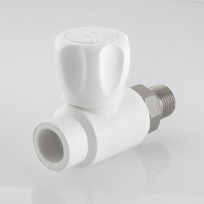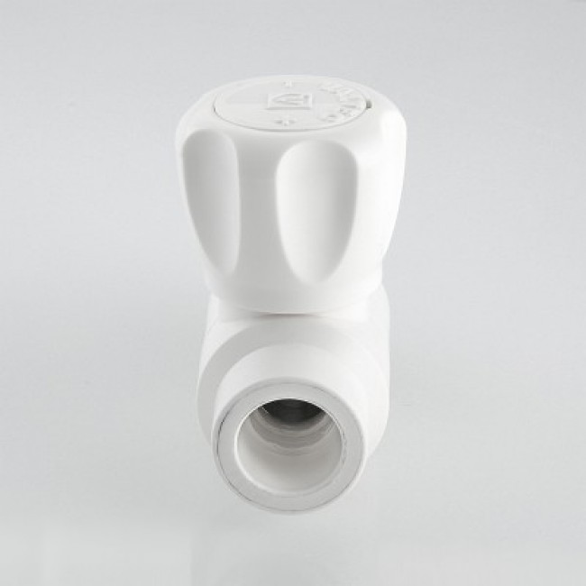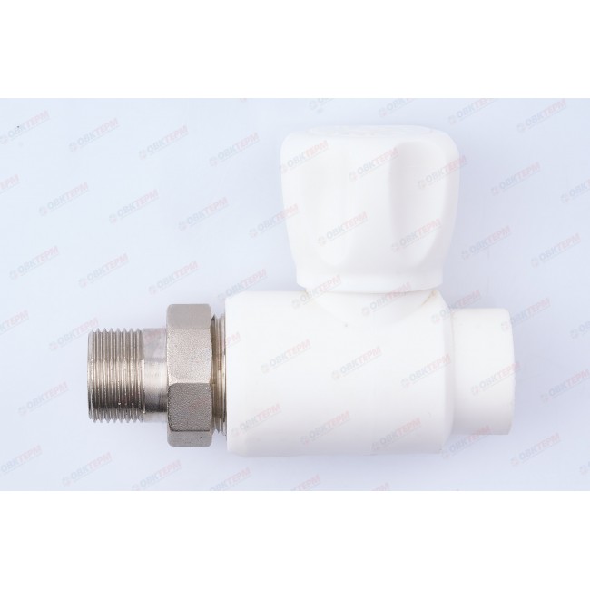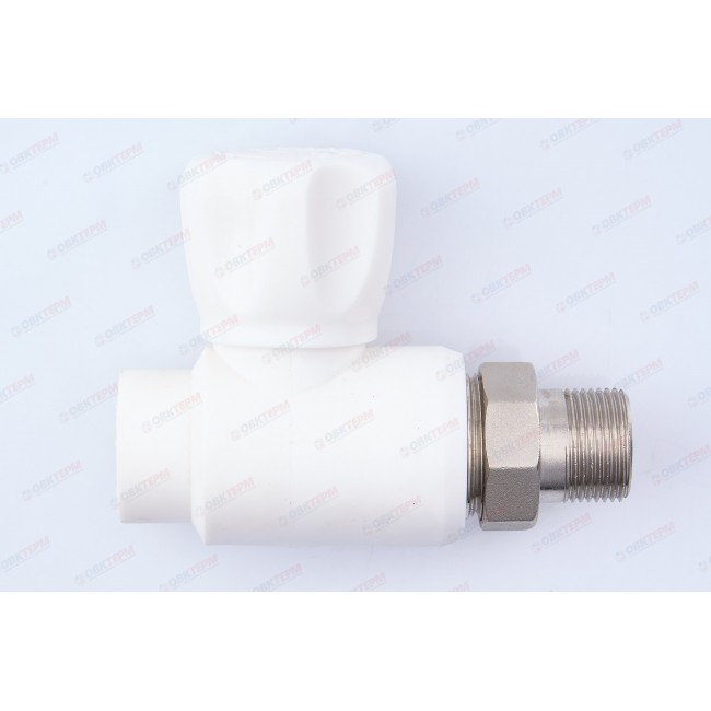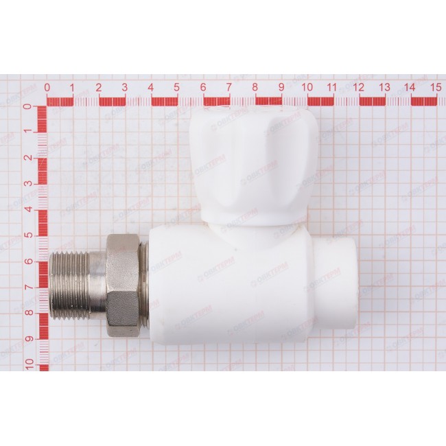 Шаровой кран с полипропиленовым корпусом, прямой. Применяется для подключения к разводке из полипропиленовых труб. Позволяет перекрывать поток теплоносителя через отопительный прибор. Подключение крана производится с помощью латунного никелированного полусгона, закрепленного на закладной детали накидной гайкой. Соединение с трубой – раструбной сваркой. Шаровой затвор и шток крана выполнены из латуни, затвор хромирован. Кран неремонтопригоден. Наработка на отказ – 3 тыс. циклов. Расчетный срок службы – 15 лет. Рабочая температура теплоносителя – до 90 °С, рабочее давление – до 10 бар. Кроме отопления, полипропиленовый кран можно использовать в водоснабжении, включая питьевое, и технологических установках.