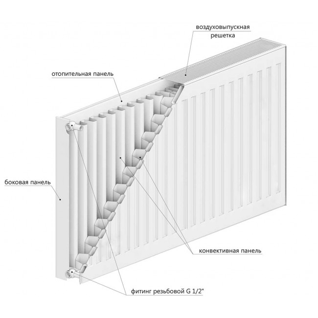 Благодаря своим конструктивным особенностям панельный радиатор показывает отличную теплоотдачу, используя малое количество теплоносителя. Форма радиатора придает ему универсального современного дизайна, что позволяет использовать панельный радиатор в бытовом и промышленном секторе. Горячая вода поступает в радиатор через фитинг (тройник), который распределяет её на переднюю и заднюю панели. Теплоноситель, проходя внутри панели, отдает тепло на внешние стенки прибора; они в свою очередь, излучают частично тепловую энергию в отапливаемое помещение, остальное тепло отдается через теплообменник с помощью естественной конвекции. Преимущества стальных панельных радиаторов: высокая теплоотдача; экономичный расход теплоносителя; высокий уровень защиты от коррозии; цветостойкость;