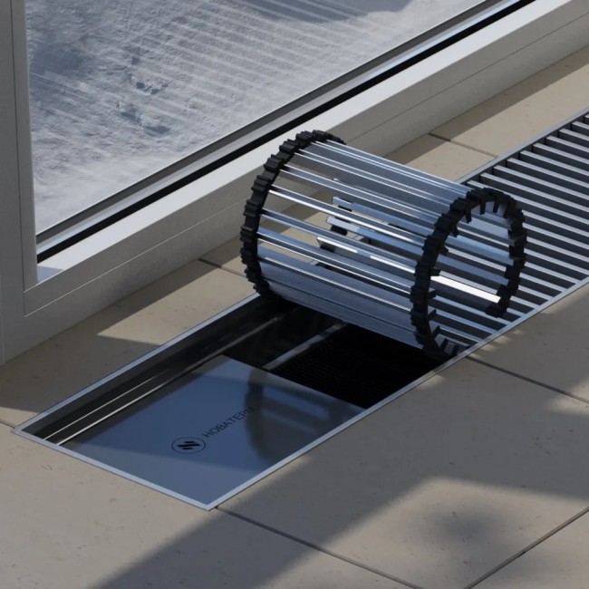 Внутрипольные конвекторы отопления Новатерм серии НТ-В рассчитаны на применение для обогрева помещений с большой площадью остекления, таких как дома, квартиры, бассейны, производственные и складские, торговые и офисные, а также жилые помещения. Встраиваемые конвекторы Новатерм представляют собой уникальные современные отопительные приборы, монтаж которых возможен в пол, подоконник и другие места, куда невозможно установить стандартные радиаторы. Конвектор Новатерм НТ-В состоит из установочного корпуса, изготовленного из стального оцинкованного листа толщиной 1 мм с кронштейнами для крепления корпуса ко дну внутрипольного канала и юстировочными винтами для установки конвектора по высоте, нагревательного элемента с воздухоотводчиком на обратном присоединительном патрубке и декоративной алюминиевой решетки для забора и выпуска воздуха.