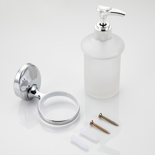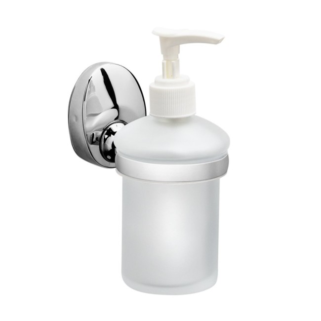 Колба изготовлена из прочного стекла, на которое нанесено матовое напыление. Зафиксирован дозатор в настенном держателе. Хромированное покрытие устойчиво к потускнению, легко очищается и придает аксессуарам зеркальный блеск.