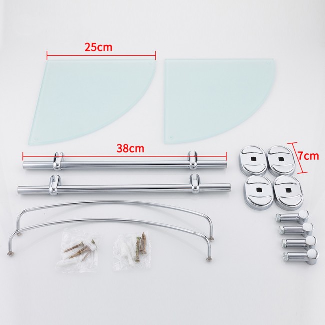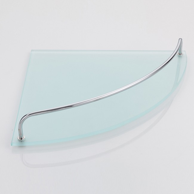 Угловая полка с двумя стеклянными ярусами. На каждой полке имеется ограничитель. Выполнена из качественной нержавеющей стали. Монтаж осуществляется с помощью дюбелей, идущих в комплекте.