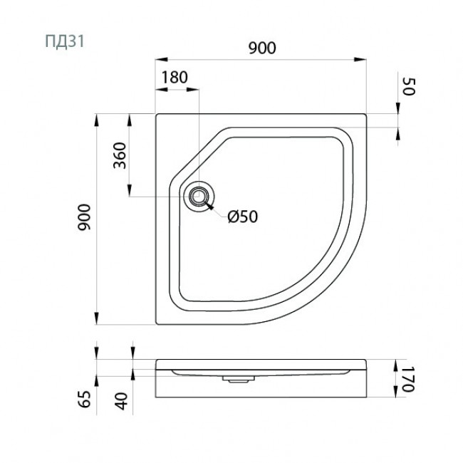 ДЛИНА 900мм; ШИРИНА 900мм; ВЫСОТА 170мм; ВЫСОТА ЭКРАНА 130мм; ГЛУБИНА 65мм; РАДИУС 556мм; МОНТАЖ - стальной каркас; ДИАМЕТР СЛИВА 50мм;