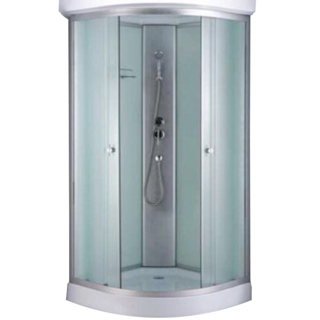 Передние стекла: 4 мм,матовые ; Задние стекла: 4 мм, белые в металлическом каркасе. Высота поддона 13 см. Серая панель,верхний душ, ручной душ с держателем, стеклянная полка, смеситель.