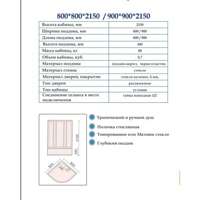 Душевая кабина ODA-8401 P 90*90*215 (матовое стекло 4мм, глубокий поддон)