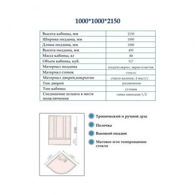 | Установочная глубина душевой кабины, мм | 1000 |