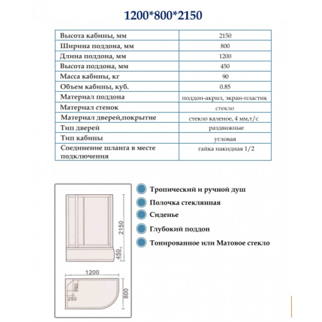 | Установочная ширина душевой кабины, мм | 1200 |
