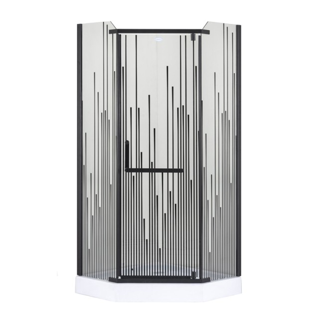 Стекло 8 мм, прозрачное с узором "ЗВЕЗДОПАД". Комплектующие из нержавеющей стали и алюминия "ЧЁРНЫЕ". Ручка из нержавеющей стали. Распашная дверь на стальных петлях. Монтажный размер при необходимости просьба уточнять в индивидуальном порядке.