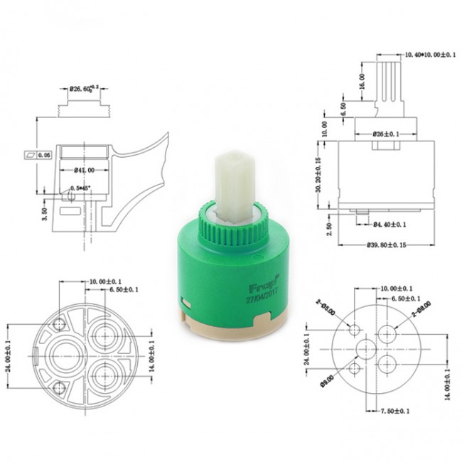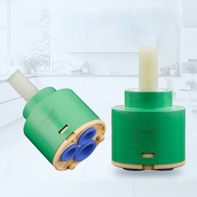 Количество в коробке: 500шт. Картридж FRAP диаметр 40 мм, пластины смешивающие воду пластик, сетка для предотвращения попадания мусора, латунный шток с колпачком под ручку, уплотнитель.
