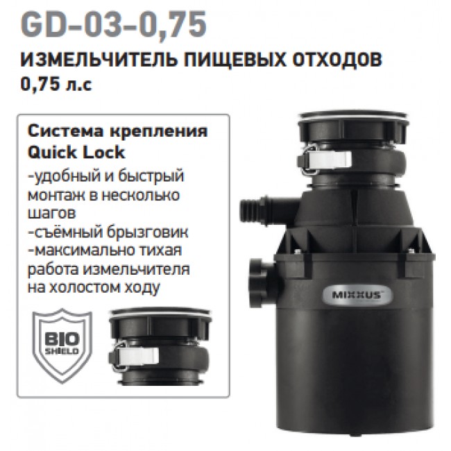 MIXXUS GD-03-0,75 Измельчитель пищевых отходов, 560Вт, индукционный двигатель