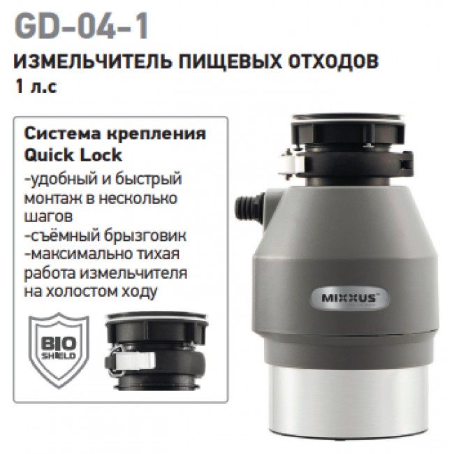 MIXXUS GD-04-1 Измельчитель пищевых отходов, 750Вт, индукционный двигатель