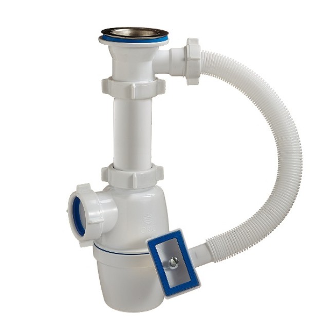 Сифон с большим корпусом и отстойником, прямоугольным переливом, выпуском, нержавеющей чашкой д.70мм для мойки с прямоугольным переливом. В комплекте две прокладки на перелив - для круглой и прямоугольной формы мойки. Необходим отвод в канализацию.