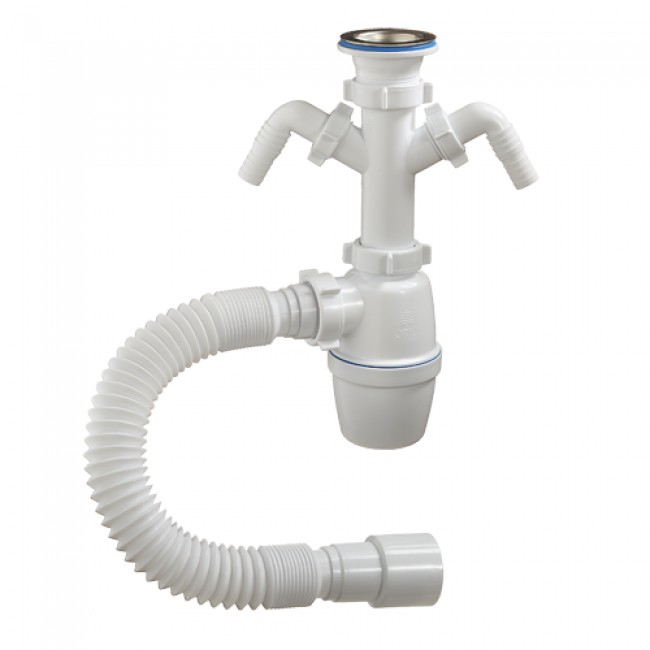 Сифон с большим корпусом и отстойником, выпуском и нержавеющей чашкой д.70мм, двумя отводами (от стиральной и посудомоечной машины) и гибкой трубой 40-40/50 для раковины или мойки.