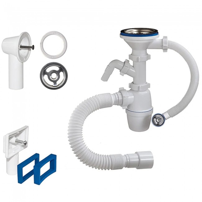 Сифон с большим корпусом и отстойником, выпуском с нержавеющей чашкой д.114мм , пластиковой втулкой и одним отводом для подключения слива от стиральной или посудомоечной машины для мойки с переливом. В комплекте два перелива - прямоугольный и круглый, а так же отвод в канализацию гибкая труба 40-40/50мм.
