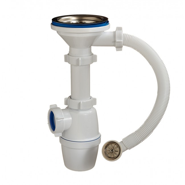 Сифон с большим корпусом и отстойником, выпуском с нержавеющей чашкой д.114мм для мойки с круглым переливом. Необходим отвод в канализацию.