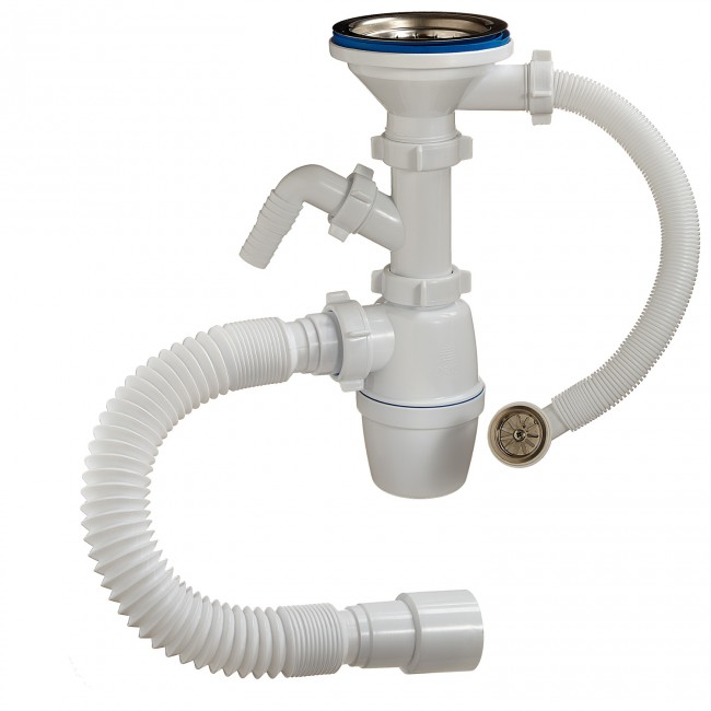 Сифон с большим корпусом и отстойником, выпуском с нержавеющей чашкой д.114мм, переливом, отводом для слива от стиральной машины и гибкой трубой 40-40/50, для мойки с круглым переливом.